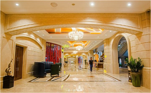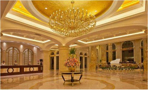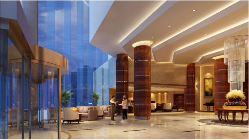 中廳區域是酒店裝修中大堂的主要區域,除了有交通集散的功能,還有等候和咨詢的作用。中廳照明要顯示出華麗感,一般采用直接照明,也可在中間懸掛巨型吊燈或水晶玻璃吊燈,以突出富麗堂皇的氣派。中廳區域的墻面可以采用壁燈或者投光類燈具照亮,以使其更具開闊感。大堂照明節奏感變化豐富,常用燈光的變化來劃分區域。