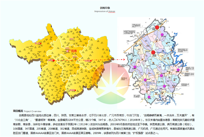 劍閣縣地處四川盆地北部邊緣,四川、陜西、甘肅三省結(jié)合部,位于四川省北部,廣元市西南部,守劍門天險,“劍閣崢嶸而崔嵬,一夫當(dāng)關(guān),萬夫莫開”,有“川北金三角”、“蜀道明珠”等美譽。全縣幅員3204平方公里,轄23個鎮(zhèn)、34個鄉(xiāng),總?cè)丝?76794人(2014年末)。東漢末境內(nèi)始置當(dāng)?shù)驴h;南朝劉宋元嘉初僑置南安郡、南安縣,治所在今普安鎮(zhèn),多經(jīng)變革后于民國2年(1913年)改劍州為劍閣縣。2003年9月縣政府駐地遷至下寺鎮(zhèn)。京昆高速公路、綿萬高速公路(規(guī)劃)、108國道、347國道、205省道、208省道、302省道、西成高速鐵路、寶成鐵路等貫穿境內(nèi),縣城與蘭海高速公路、廣元機場、廣元港近在咫尺。有首批國家重點風(fēng)景名勝區(qū)劍門蜀道、國家AAAAA級景區(qū)劍門關(guān)、國家AAAA級景區(qū)翠云廊等。2009年,該縣被列為四川省第二批“擴權(quán)強縣”試點縣之一。