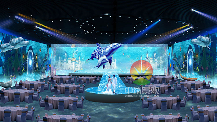 全息宴會廳以其生動逼真的全息畫面,風(fēng)格鮮明的沉浸式氛圍讓人憶猶難忘。它將“味覺、視覺、聽覺、觸覺、嗅覺”完美的融合在一起,在品嘗美味佳肴的同時(shí)又能感受到聲、光、電完美結(jié)合帶來的震撼,從而給人帶來一種全新的高端視覺體驗(yàn)。目前很多酒店關(guān)注更多的還是布場和道具,往往會忽略婚禮品質(zhì)。道具的模仿或許能換來一時(shí)的新鮮、刺激暫時(shí)的消費(fèi),但在婚禮理念上存在缺位、缺乏核心競爭力。