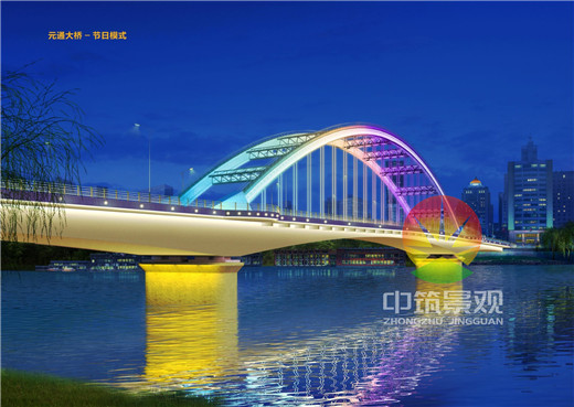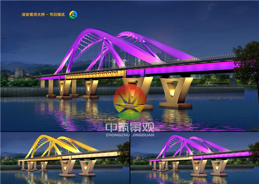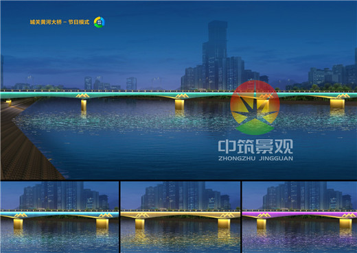 亮化結(jié)果:橋梁夜景照明設(shè)計(jì)不僅要與橋梁周邊環(huán)境融為一體還要凸顯出橋梁的美感和藝術(shù)性,照明科學(xué)與橋梁建筑藝術(shù)有機(jī)結(jié)合拓展橋梁的景觀表現(xiàn),充分利用人工光的虛實(shí)、動(dòng)靜的表現(xiàn)特征渲染空間變化效果。利用燈光體現(xiàn)橋梁的質(zhì)感、肌理、建筑特性,展現(xiàn)橋梁的一種形態(tài)美,光源避免干擾橋梁的功能,影響橋面和水面的的交通安全,避免強(qiáng)點(diǎn)光源或強(qiáng)光干擾駕駛?cè)藛T視線,注重人的視覺(jué)舒適度,避免造成光污染。本次橋梁設(shè)計(jì)中采用高效節(jié)能LED光源,提高光效,節(jié)約用電,降低能耗;針對(duì)黃河上不同的橋梁造型選擇了不同的設(shè)計(jì)方案,每個(gè)設(shè)計(jì)方案又可以根據(jù)不同的時(shí)期打造平日和節(jié)日兩種氣氛,將燈光變色技術(shù)以及控制網(wǎng)絡(luò)集成到一個(gè)整體解決方案中,燈光在橋上交叉流動(dòng)變幻,通過(guò)水平和垂直表面上投射不同的顏色,以多維立體的方式在夜間呈現(xiàn)橋梁的空間結(jié)構(gòu),實(shí)現(xiàn)整體藝術(shù)效果。