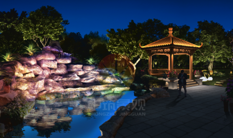 假山水池(利用專業(yè)燈光色彩搭配,巧妙的投射在假山上,并與水面形成倒影)